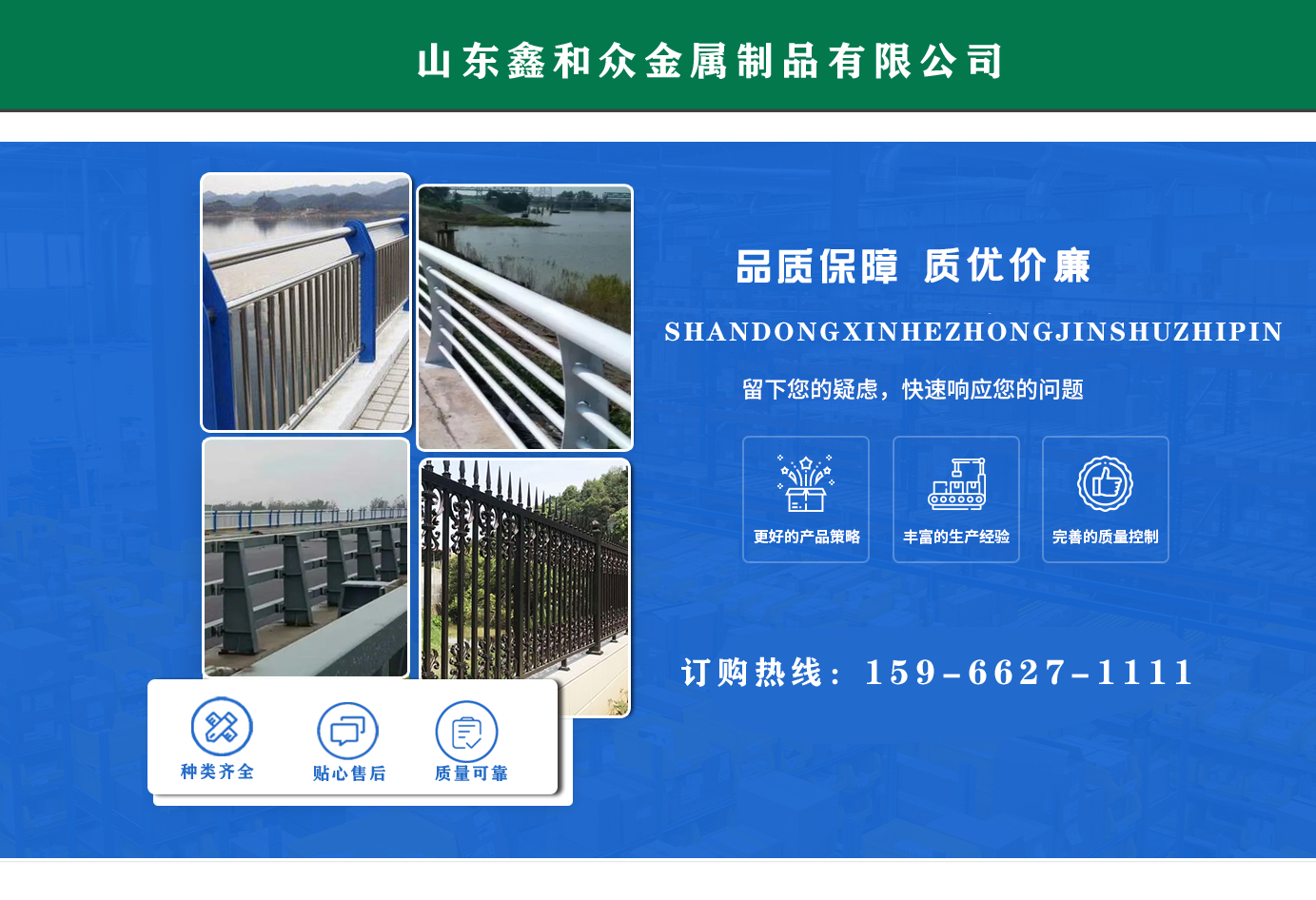 山東鑫和眾金屬制品有限公司主要產(chǎn)品有防撞護(hù)欄,橋梁護(hù)欄,道路護(hù)欄,河道護(hù)欄,不銹鋼護(hù)欄等護(hù)欄。提供設(shè)計(jì)方案,一站式定制,包您滿意價(jià)格優(yōu)惠,歡迎來(lái)電咨詢! 公司常年從事銷(xiāo)售護(hù)欄防撞護(hù)欄,橋梁護(hù)欄,道路護(hù)欄,河道護(hù)欄,不銹鋼護(hù)欄,橋梁鋼護(hù)欄,河道燈光護(hù)欄等。產(chǎn)品廣泛應(yīng)用于橋梁、河道、旅游景區(qū)、道路、公路、公園、小區(qū)、景觀、道路防撞等領(lǐng)域?! 」井a(chǎn)品均采用優(yōu)質(zhì)不銹鋼材料,符合相關(guān)標(biāo)準(zhǔn)。各種型號(hào)不銹鋼復(fù)合管及護(hù)欄,質(zhì)量嚴(yán)格把控。產(chǎn)品強(qiáng)度高、耐腐蝕、焊接牢固、抗沖擊、性能好,防撞護(hù)欄結(jié)構(gòu)簡(jiǎn)單、美觀實(shí)用大方。 歡迎前來(lái)訂購(gòu)!...